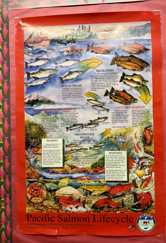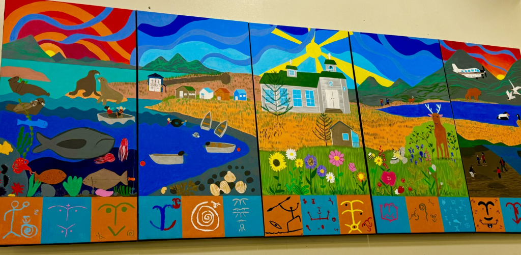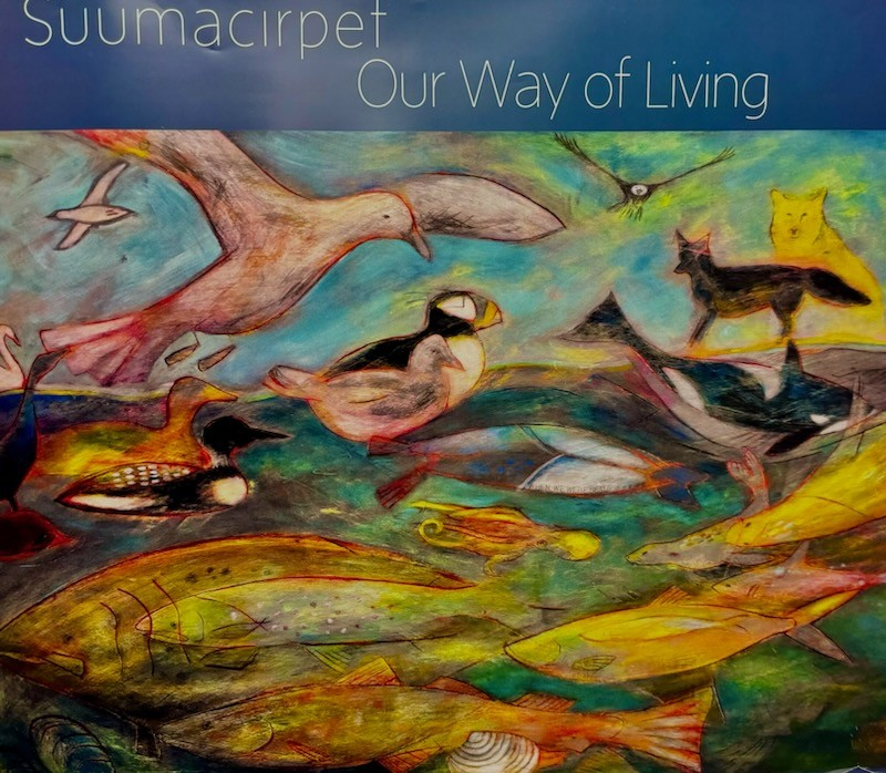 Here is a pic of a poster hung in the main hallway of the school that embodies the belief systems of subsistence on the natural resources described above. Suumacirpet means “our way of living”. The artist who painted this is Lena Amason.
