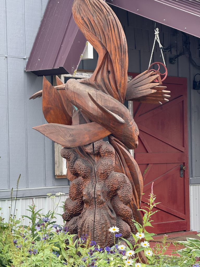 Carving of a freaky anglerfish (order Lophiiformes) in the Seldovia Village. These fish are deep water fish that are truly freaky in their appearance and bioluminescence that they use to attract prey on the deep ocean. They use their “lures” via waving them back and forth in a similar manner as fly fishermen use their imitation flies. I am not sure of the significance of this carving in the middle of town and none of the locals I talked to had any information about why its there. There is an annual chain sawing competition in Seldovia, but not sure how that related (if it even does) to this carving. Nonetheless – its cool.