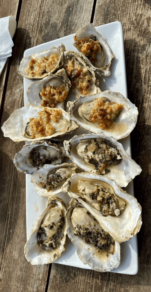 Some of the best oysters on the spit – baked with all kinds of goodness on top. Eaten on a windy afternoon on a picnic bench atop a high deck over the beach overlooking the bay. With a cold beer, of course.