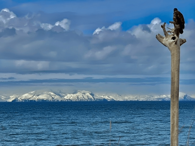 Below: taken from an Anchor Point beach overlooking the Cook Inlet to the west. A beautiful eagle keeps watch nearby. He was magnificent and seemed to not care at all that I was there sharing his view. In those mountain ranges above are Iliamna, Augustine, Douglas and Redoubt volcanoes as well as Katmai National park to the southwest and Lake Clark National Park to the northeast.
