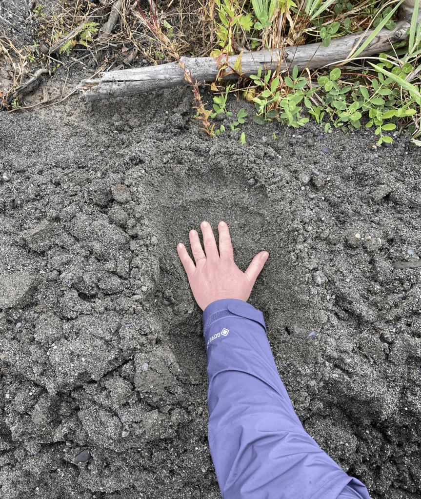 Below – My hand swallowed up by a huge grizzly track on the beach – estimated to be a large male. We followed his tracks down the beach but he was elusive.