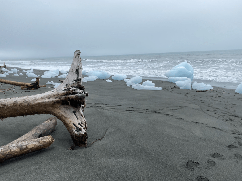 I got to this place quite by accident while flying from Juneau to Anchorage along the Pacific coast and was grounded in Yakutat for weather. We attempted to fly all the way back to Anchorage from Yakutat but landed at Icy Bay due to deteriorating weather conditions. We were only there a short time, but in that time period, I saw the most beautiful landscape ever and grizzly tracks that made my heart pound with excitement! There are icebergs that have calved from the glacier awash on the beach with large pieces of downed timber, logs, and trees standing just past the sand and surf.