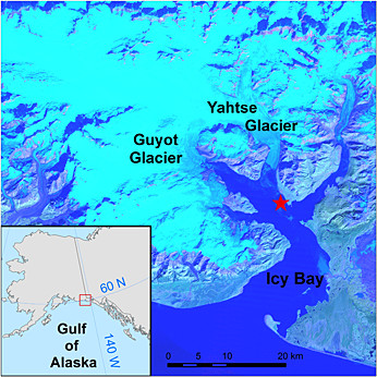 Icy Bay was formed pretty recently (in geologic timeframes) – within the past 100 years – and is located in the Wrangell-St. Elias National Park and Preserve, and formed when the Yahtse, Guyot, and Tyndall Glaciers retreated rapidly. In the early 20th century, the entrance to Icy Bay was obstructed by a huge tidewater glacier – a glacier that flows from mountains into the sea with their main mechanism of ablation (ice loss) occurring via calving icebergs into the sea. This giant tidewater glacier calved icebergs into the Gulf of Alaska (an arm of the Pacific Ocean that curves from the Alaskan Peninsula and waters surrounding Kodiak Island, and southeast to the Alexander Archipelago), and a century-long glacial retreat has resulted in a multiarmed bay that is >30 miles long.